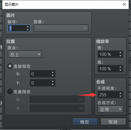 透明度/不透明度: 游戏中,”不透明度”和”透明度”的意思一样。只要有“透明度”三个字,就都是统一的:255完全不透明,0完全透明。