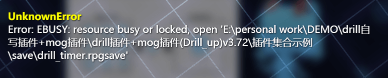 原理解析简单来说,报错来自插件:管理器-累计游戏计时器。无法打开存档文件。但是仔细排查后,发现是js的底层:文件管理系统fs出现了拒绝访问的现象。有可能是操作系统,把 drill_timer.rpgsave 文件锁定了,导致无法打开。(游戏 只读 那个文件也被拒绝了)(删掉那个文件也被拒绝了)所以可以确定是操作系统的问题,而不是游戏的问题。对于操作系统问题,一般重启就能解决。