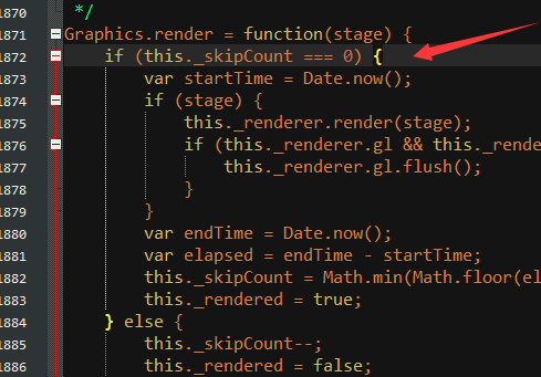 原理解析在排查问题时,我发现了一个漏洞。这个漏洞在rpg_core中1871行的Graph.render函数中,if用的是 === 判断。由于这个函数在游戏里面执行的次数非常爆炸,正常1秒有60次,如果画面卡,会变成1000次下也有可能。而问题在_skipCount这个变量, 因为 _skipCount-- 执行次数非常多,非常高的几率变成 -1,而一旦变成 -1,就再也回不到原来的循环中了。