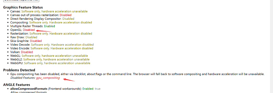 附加知识2如果你安装了谷歌浏览器,但是发现仍然只能用Canvas进行渲染,那么可以用谷歌浏览器搜索一下WebGL渲染是否可用。打开谷歌浏览器,然后进入到这个网页:chrome://gpu/作者我有问题的时候,出现了下面的文字:OpenGL不可用,可能是gpu计算不支持。然后我按照 解决方案3 更新驱动,解决了此问题。解决问题之后,再回来看看这个网页,发现显示文字不一样了:
