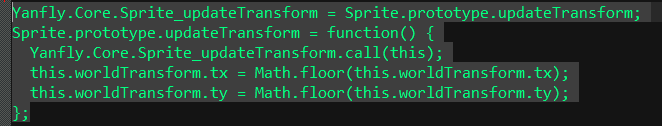 原理解析作者我写气泡框插件,再次出现了抖动问题。为了找到问题,作者我单独使用气泡框插件,结果抖动问题消失了。经过摸索,终于定位到了是YEP插件。插件中有下面的代码:这是一个令人迷惑的操作,为什么要用floor?而不是round?很可能是YEP想当然地认为floor这是一种优化,而导致的bug。通常情况下位置偏差不会很大,所以看不出来。但极端情况下,坐标采用Math.floor会造成下面的问题:两个不同的贴图,本身处于的位置有小数点。但贴图被floor后,造成了间隙。(1.95变成了1.00)