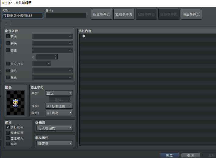 设置后,你就能通过 键盘/手柄/鼠标/触屏 对一个事件进行与玩家一样的移动操作了。