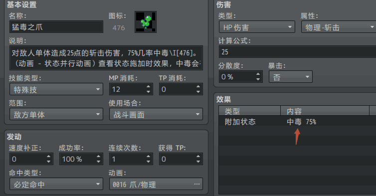 - 添加一个可以75%施加这个状态技能,战斗中强制释放技能,查看效果。该步骤,用于查看状态施加的时机是否符合你的预期。包括状态施加成功与施加失败的情况。