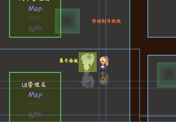在地图界面中,点击玩家贴图,即可展开面板。点击其他位置,则会执行移动到目的地,或者收起面板。比如图中橙色文字和区域。