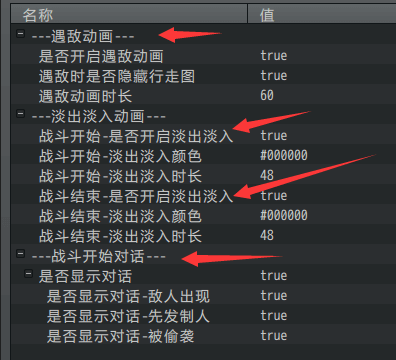 遇敌动画、战斗开始-淡出淡入动画、开始战斗对话、战斗结束-淡出淡入动画