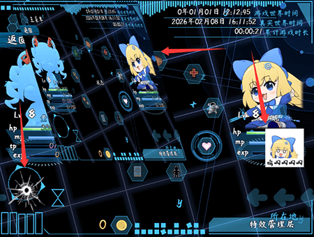 天窗层的装饰如下图。包含:斜切的动态快照、GIF实现的表情包、魔法圈实现的弹痕。装饰能跨 地图+战斗+菜单 界面。