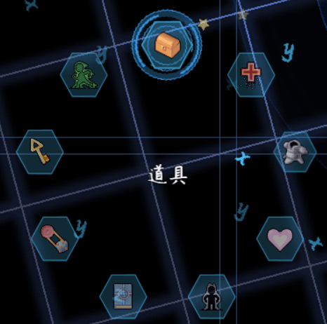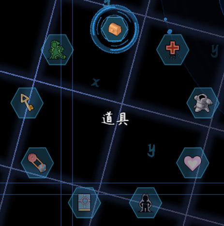 菜单界面的装饰如下图。红色为菜单魔法圈,紫色为菜单粒子,黄色为菜单背景(扫描线背景和箭头背景)。背后的网格也是菜单背景。![]() |