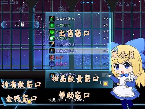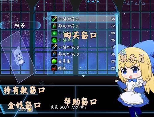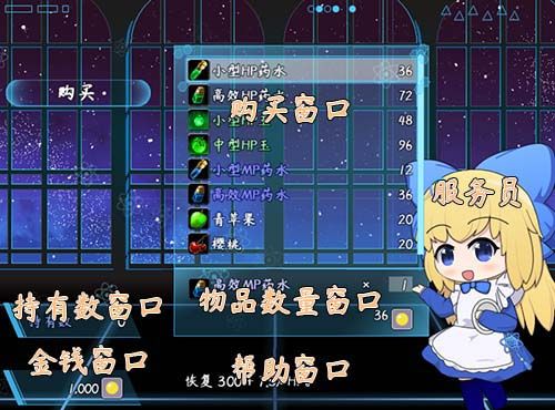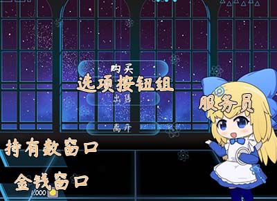 2).点击购买 > 部件:服务员 + 金钱窗口 + 持有数窗口 + 购买窗口 + 帮助窗口 +(选项按钮)【图2】