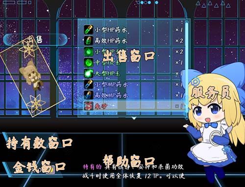 4).选择一个物品 > 部件:服务员 + 金钱窗口 + 持有数窗口 + 出售窗口 + 物品数量窗口 + 帮助窗口 +(选项按钮)【图4】