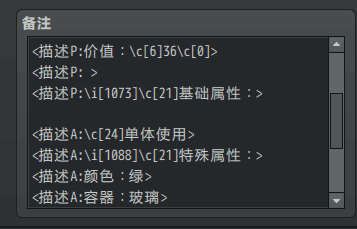 在物品备注中添加相应的注释,换行就另建立一个<描述A: xxx >标签,注释的描述支持添加图标\i[]和颜色\c[]。