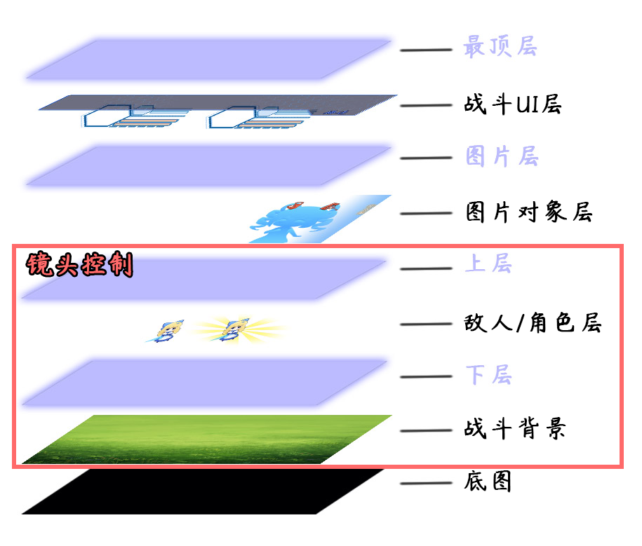 在战斗界面中,镜头控制 战斗背景至上层 之间的所有图层。