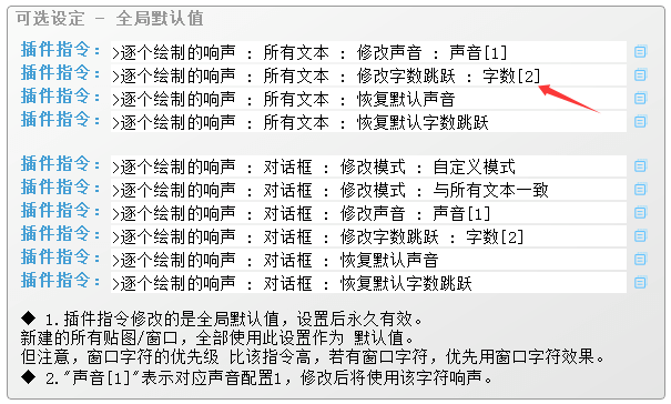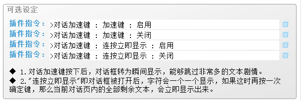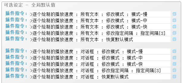 注意,该插件的全局默认值设置中,所有文本 和 对话框 分开设置速度。使用插件指令,需要区分 所有文本 和 对话框 两种情况。![]() |