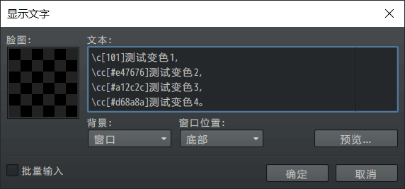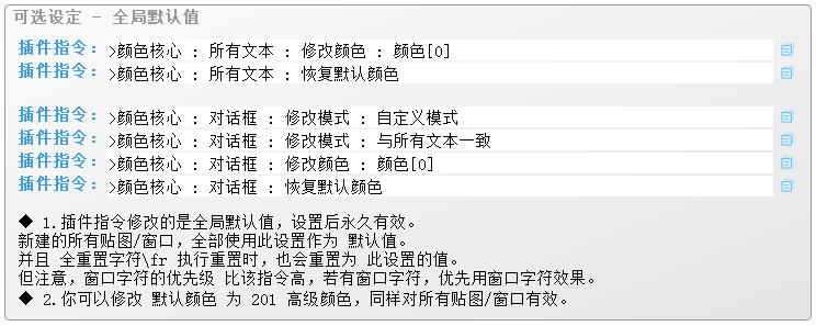 | 插件提供了 所有文本和对话框 的自定义文本颜色设置,可以通过插件指令修改,且修改后永久有效。 |