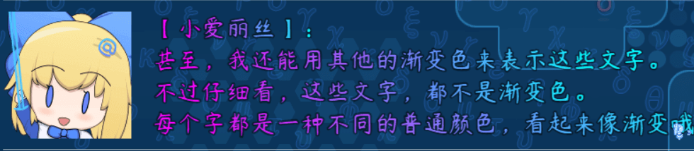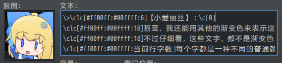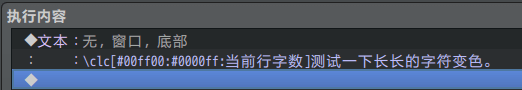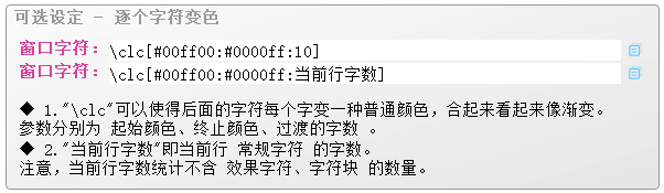 | \clc[#00ff00:#0000ff:当前行字数] | 之后文字按当前行字数渐变显示普通颜色。 |