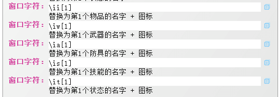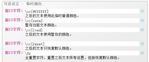 | \c[0] - \c[31] | 之后文字显示为窗口皮肤颜色。 |
