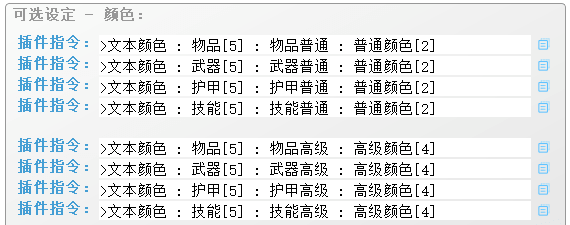 | 注意修改文本颜色的插件指令中,有两个“普通”;两个“高级”哦。修改指令时,容易看漏文本。 |