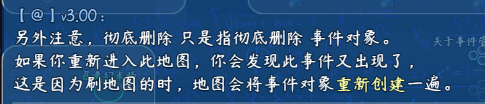 | 并不是所有事件都需要调用 彻底删除 指令。而是那些可能被复制1000个的弹丸事件,才需要 彻底删除,避免累加性能消耗。所有事件最终都会在离开地图时一并销毁,进入新地图时再重新创建另一批事件。 |
