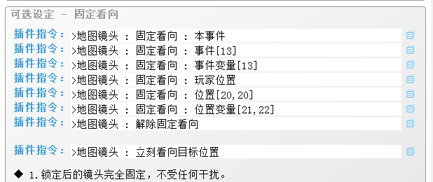 如果你想要看向某个事件,而不是从玩家的中心点进行聚焦偏移,那么使用固定看向指令即可。