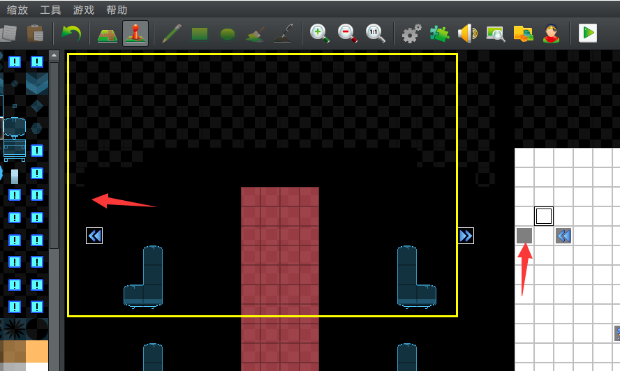 可以看到事件(红箭头)、背景(紫箭头)、图块(黄箭头)是三个分离的层次结构。