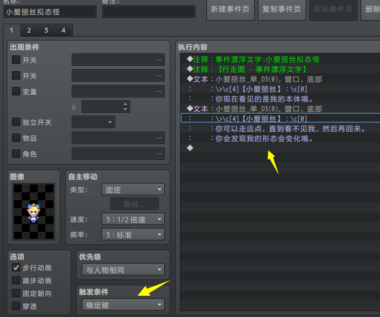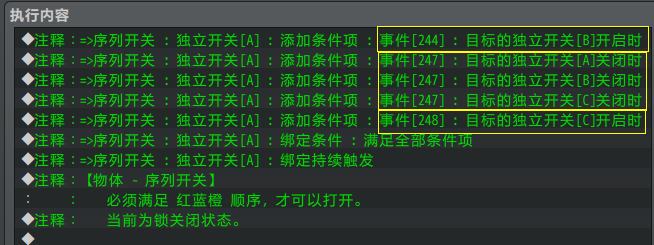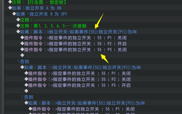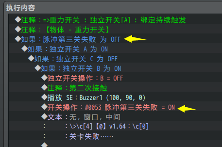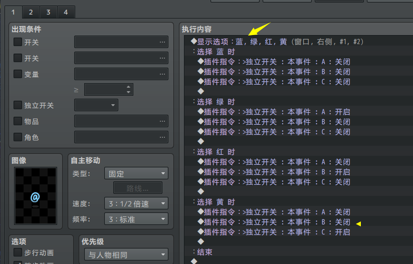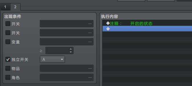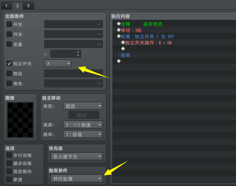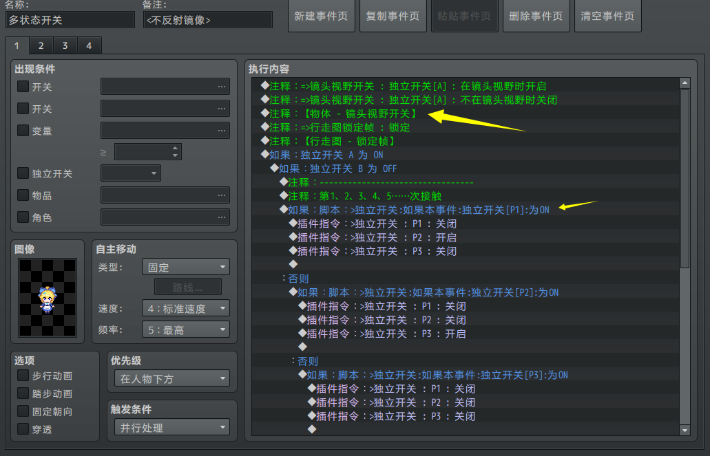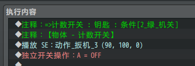 | 4 | 独立开关C | 开关按下状态 | 并行判断A的开关;**如果A被关了,立即关闭C,**这样就跳转到了事件页2。 |