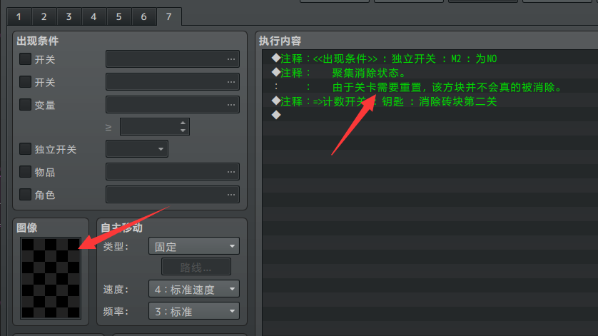 | 原设置为 重力开关,要求玩家踩一次才会开启独立开关A,然后多状态变化。这里将重力开关换成镜头视野开关,触发条件就由”踩一次”变成了”看见一次”。 |