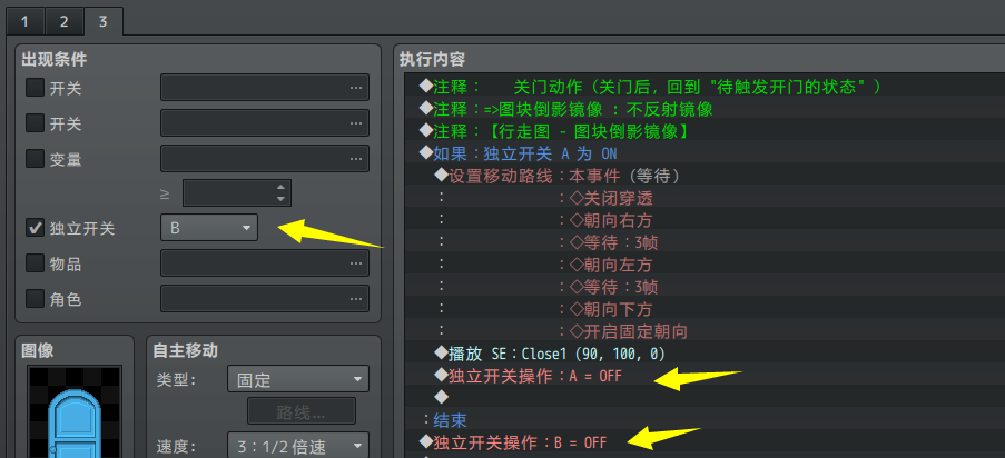事件页3用独立开关B,执行完后,关闭A(开门状态)和B(关门动作本身)。