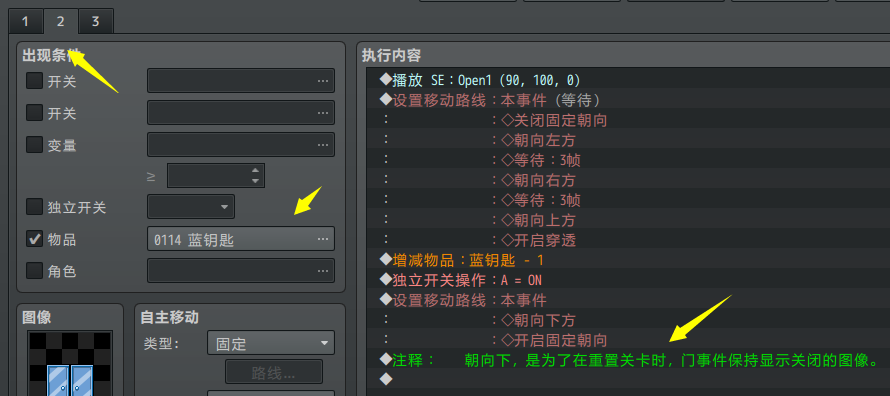 一把钥匙只能开一扇门,也就是说,只要玩家身上有蓝钥匙,那么就能开启蓝色的门,开启门后钥匙-1即可。