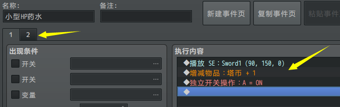 注意,捡起道具后,必须设置为 开启独立开关A进入到空事件页。