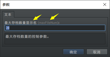 | ** @param maxFileNum* @text 最大存档数量显示名* @type text* @desc 最大存档数量的控制参数。* @default 20* |